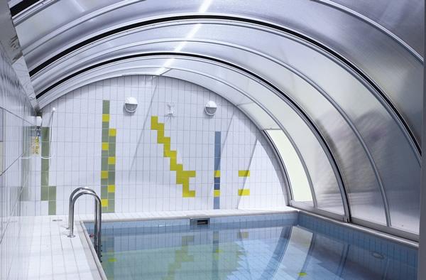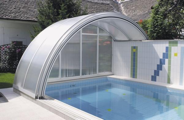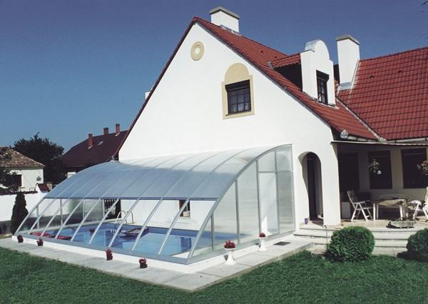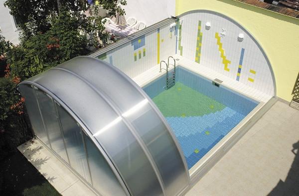 Compact Copertura molto adatta per coprire le piscine vicinissime agli edifici, siccome una parte della copertura si appoggia sul muro dell'edificio. Le coperture »Compact« si possono usare anche per la vetrata delle verande e terrazze grazie alla sua forma. La vetrata standard è con doppio policarbonato UV resistente di spessore 10 mm. Larghezza standard della copertura è fino a max. 7 m (misure esterne - vedi caratteristiche tecniche). Questa copertura è fatta con i profili più forti, le rotaie sono forti, di spessore 20 mm. |