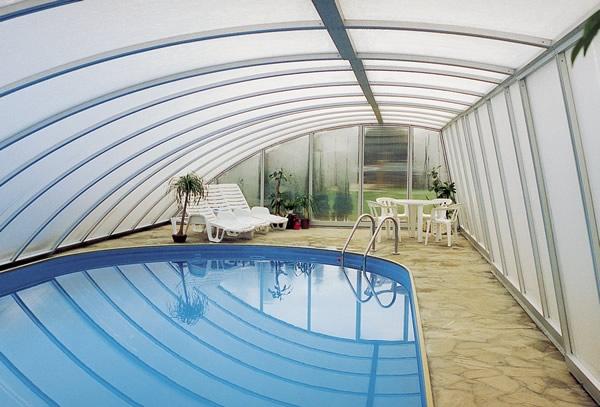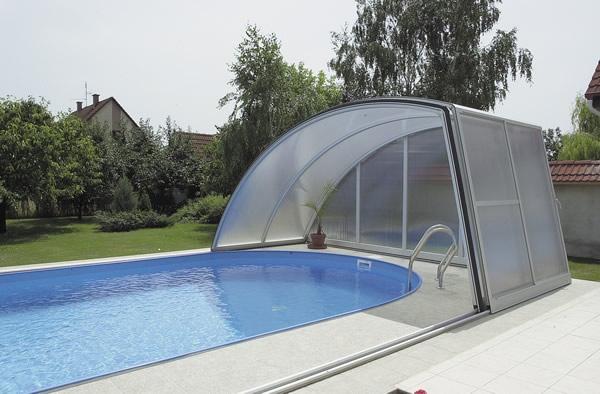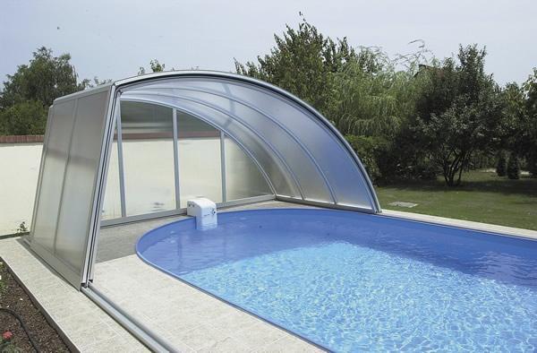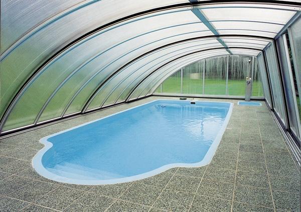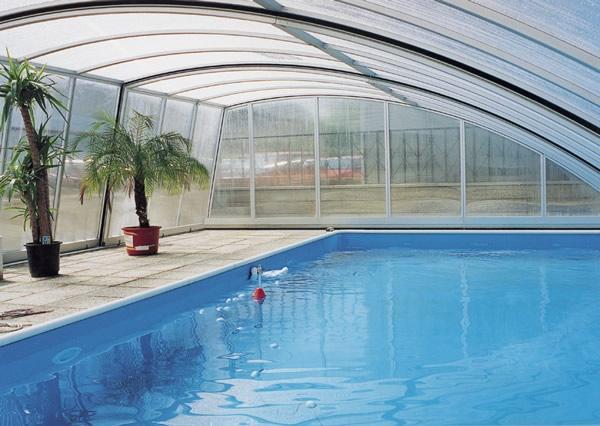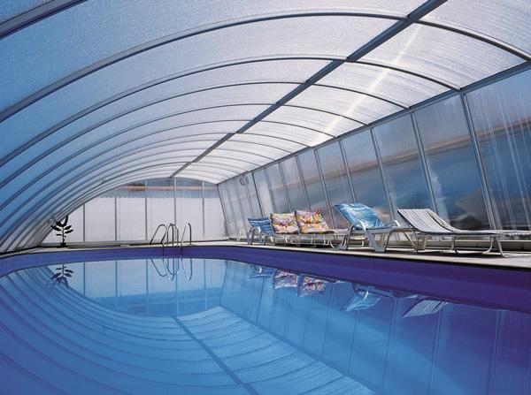PanoramaStreha, ki zaradi svoje oblike omogoča panoramski pogled, še posebej, če je njena ravna stranica iz prozornega SAN ali polikarbonat materiala. Zaradi prostornosti te strehe je omogočeno plavanje in počitek ob bazenu tudi ob hladnejšem in vetrovnem vremenu (še posebej, če je streha nekoliko daljša od bazena). Standardna širina strehe je do max. 8 m (zunanje mere - glej tehnične značilnosti), izdelana je iz močnejših profilov, tirnice so močne, debeline 20 mm. |